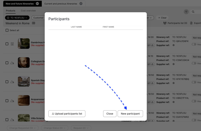 Find and click the Participants list button just below the filters to save or upload participant details for the selected itinerary.