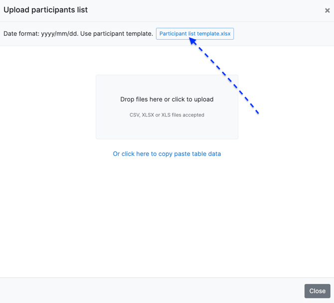 Select Upload participant list, download the provided Excel template, fill in the details, and upload it back into the system.