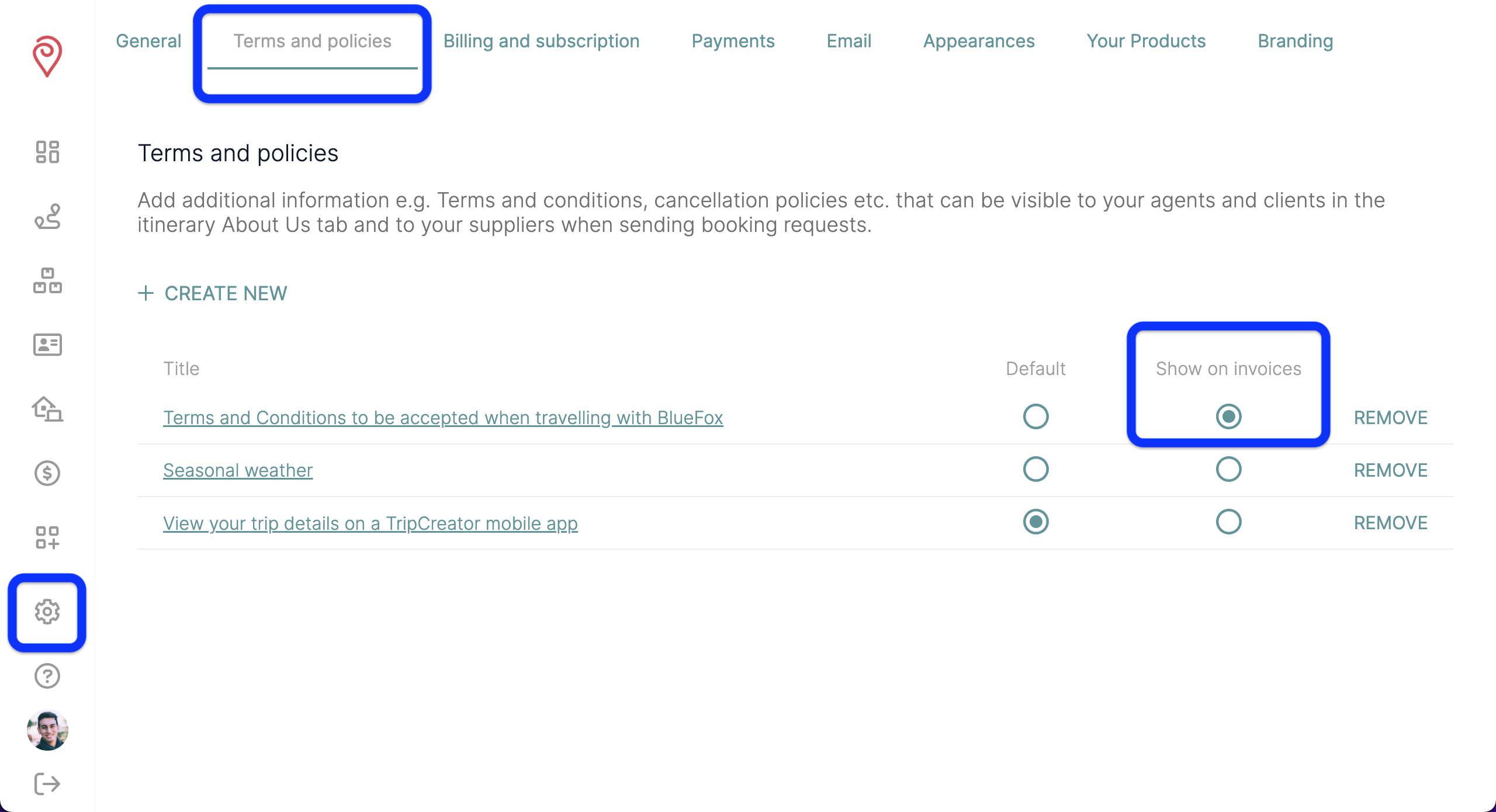 - Then, choose the document you want to show by enabling it in the Show on invoices column.